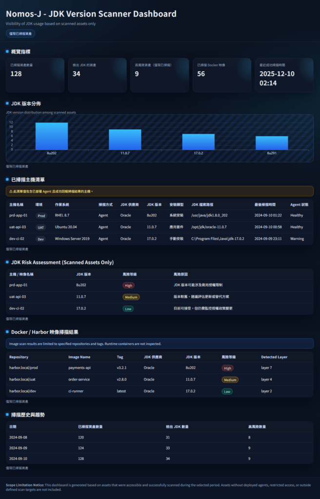 Nomos-J 的目的不是干預系統運作,而是讓組織清楚知道目前實際部署了哪些 JDK、分布在哪裡、版本為何,